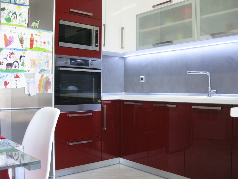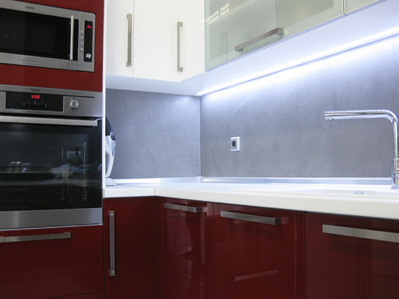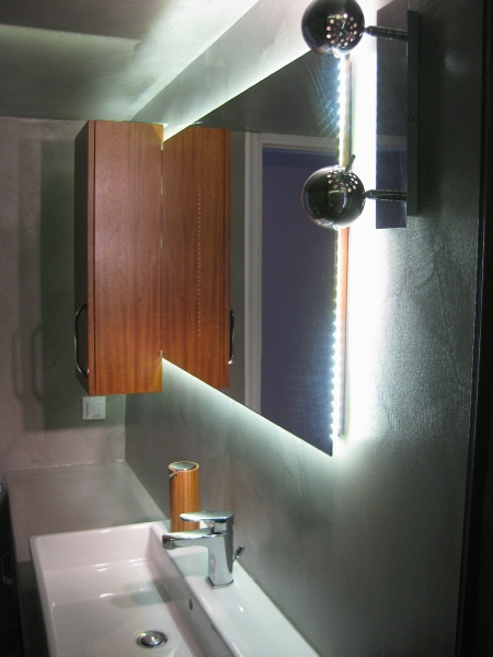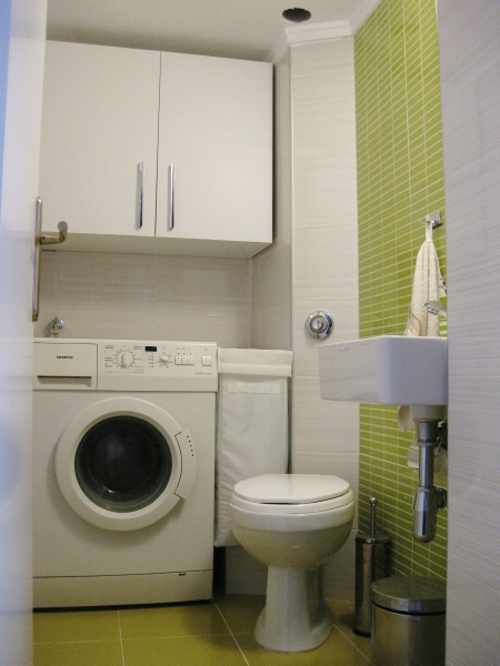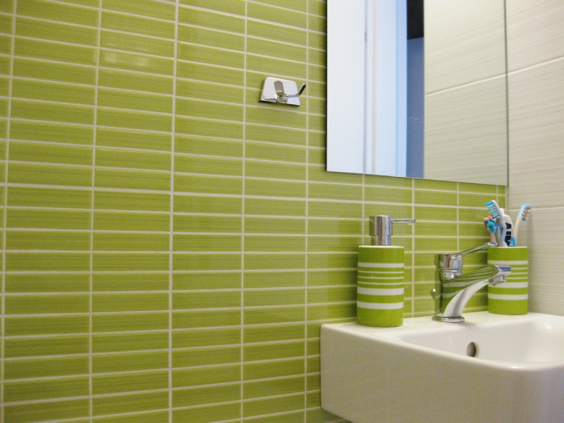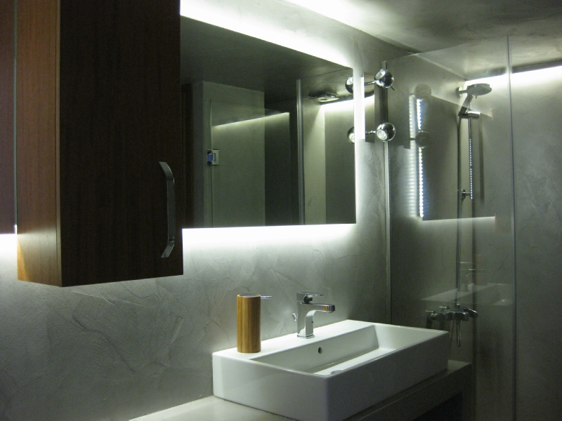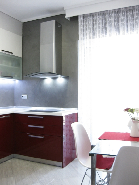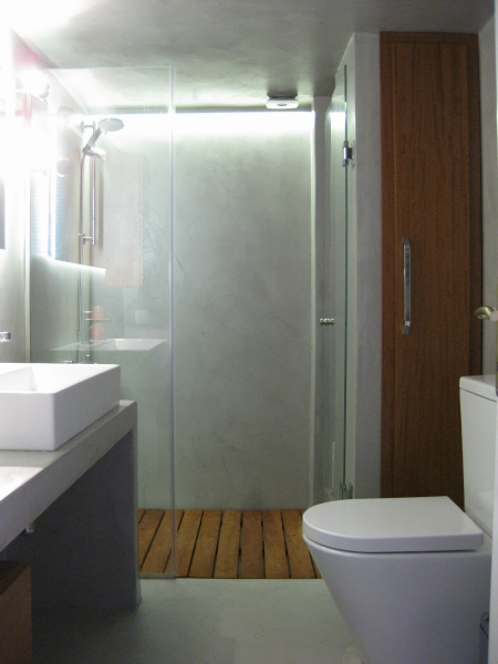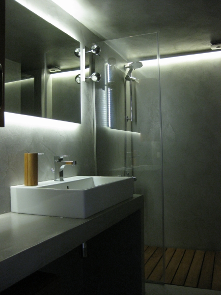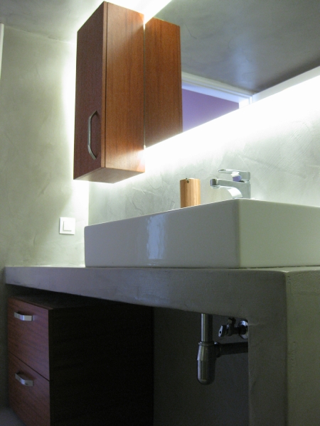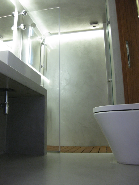 Η κουζίνα επανασχεδιάστηκε για να ικανοποιεί πλήρως της ανάγκες της οικογένειας, δίνοντας ένα έντονο χαρακτήρα με τη χρωματιστή λάκα και την ειδική τεχνοτροπία πατητής τσιμεντοκονίας αντί της συμβατικής επιλογής των κεραμικών πλακιδίων. Τα λουτρά ανακαινίζονται ριζικά, διατηρώντας τη θέση τους αλλά όχι τα υλικά τους. Το βασικό λουτρό της κατοικίας επανασχεδιάζεται ριζικά και ντύνεται με γκρι πατητή τσιμεντοκονία -